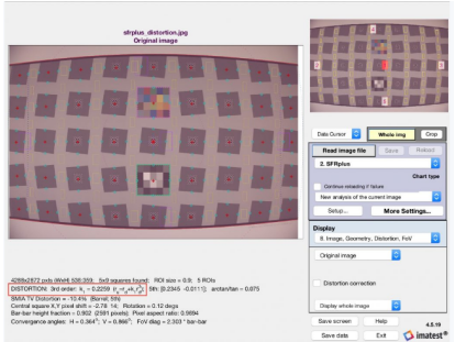 (1)將分辨率測試卡SFRPlus圖像加載到軟件中,并對其進行分析,以確定逆變換算系數(shù)(顯示在Rescharts交互模塊中)。(或者,將圖像加載到Dot Pattern模塊中并從中檢索LGD系數(shù),并將其轉(zhuǎn)換為逆變換系數(shù),然后跟隨其余步驟)。將它們加載到MATLAB中。