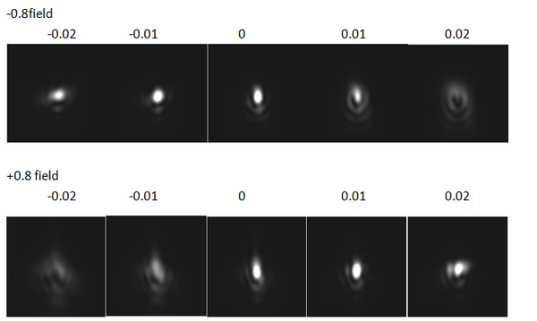 從mtf through focus曲線看出,像面tilt是MTF NG的主要原因。以+/- 0.8F為例,我們看看through focus的點(diǎn)像如何。