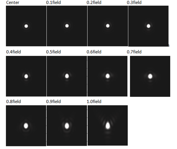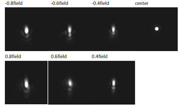 從上圖很容易看出,Y軸方向代表T,-0.8field在defocus-0.01是Y方向光線匯聚最佳的,而+0.8field在defocus 0.02的時(shí)候Y方向最匯聚,但是X方向卻發(fā)散,意味著S方向在defocus +0.01匯聚最佳。要矯正+/- 0.8field,可以選擇傾斜sensor,使sensor image plane 正方向落在defocus 0.01mm位置,而負(fù)方向落在-0.01mm,此時(shí)系統(tǒng)擁有最佳的組合解析力。因此鏡頭的測(cè)試不僅可以鑒別鏡頭的質(zhì)量也可以為成像系統(tǒng)的設(shè)計(jì)增加更多依據(jù)。