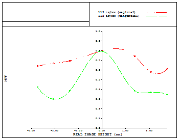 其MTF vs field數(shù)據(jù)如下,是顆很差的鏡頭,尤其是T方向差。