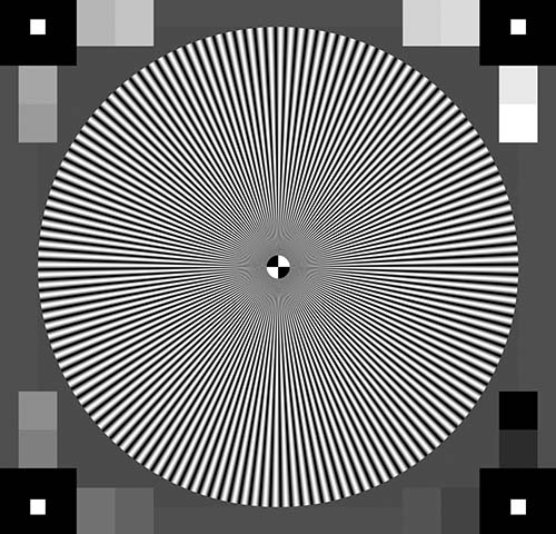 對于所有圖像,圖像中心的極限分辨率都是基于ISO12233:2014中的算法。這個方法是基于圖2中的正弦西門子星。相機(jī)還原測試圖案并創(chuàng)建一個圖像。用軟件去讀取圖像并對圖案中的不同部分去分析。西門子星周圍的灰階是用于線性化和標(biāo)準(zhǔn)化,中心的標(biāo)記點是作為分析檢測的一個起始點。從星的外部到中心,圖像的數(shù)值伴隨著半徑的變化被讀出來??臻g頻率可以通過已知的西門子星線對(這里是144)和半徑計算出來。從數(shù)值擬合出的調(diào)和函數(shù)可以計算出調(diào)制度。通過這個方法,如果RAW數(shù)據(jù)不能獲得,那么獲得的SFR會有銳化的增強和其他圖像算法增強,這對于測量極限分辨率是非常有用的。
